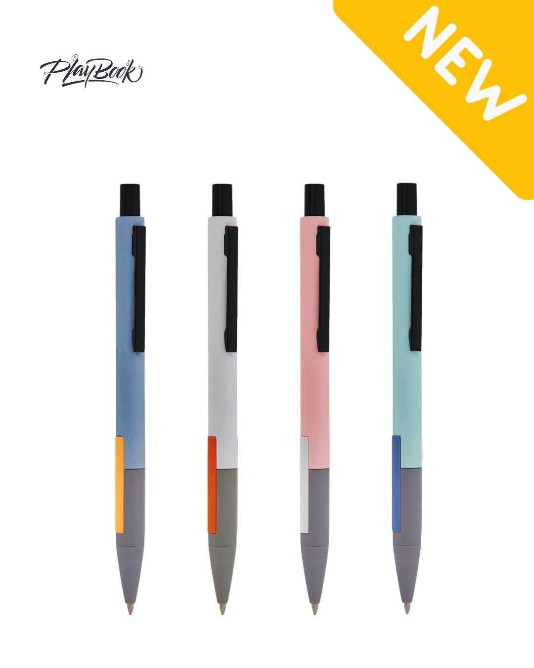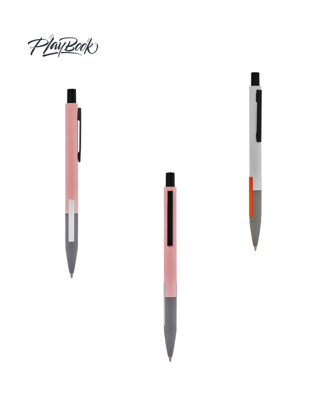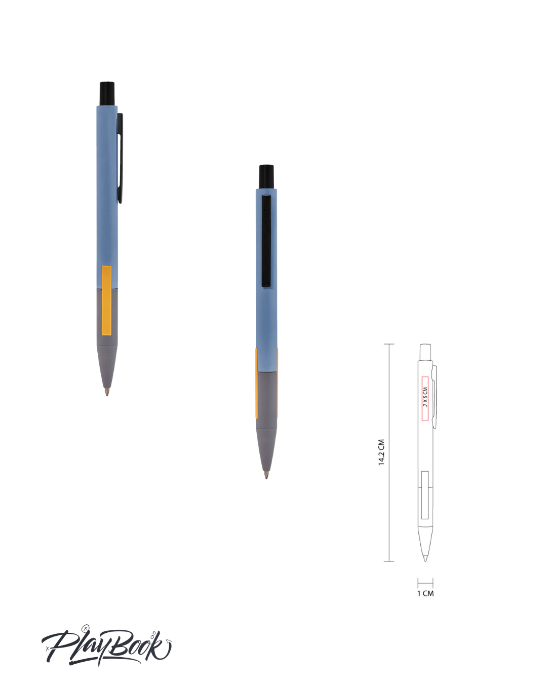 Bolígrafo con barril combinado en color y punta gris. Botón y clip color negro. Grip de plástico en color. Mecanismo push. Incluye funda.