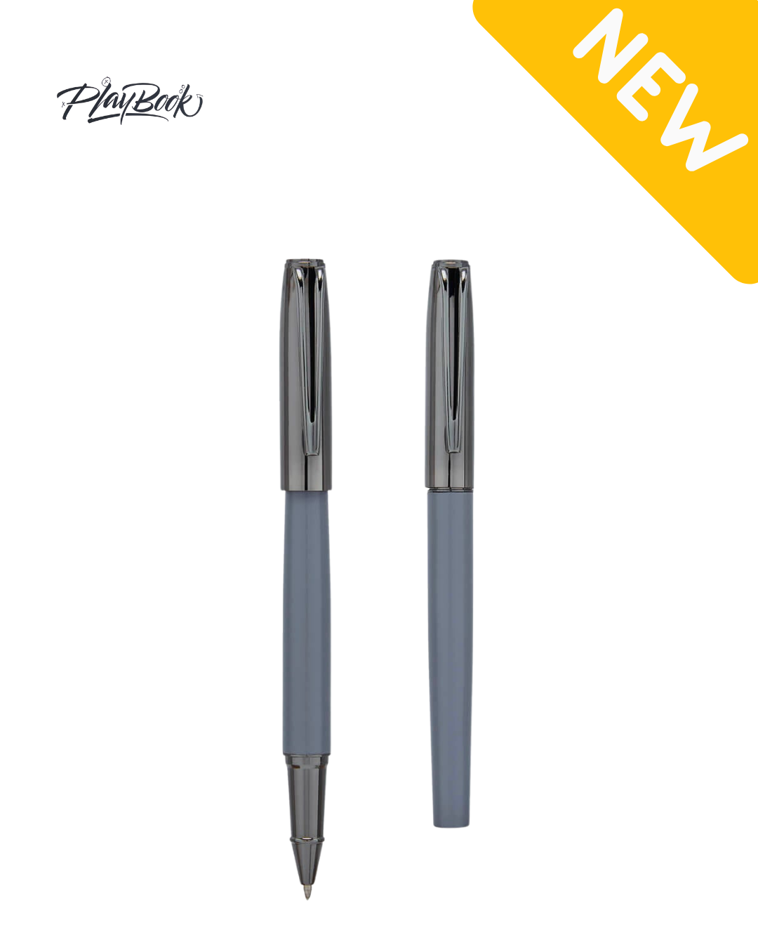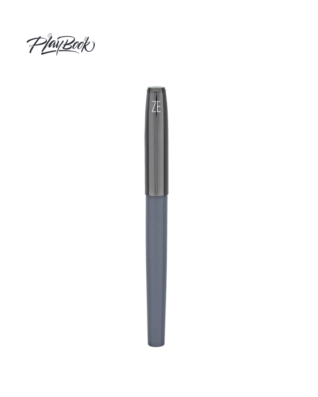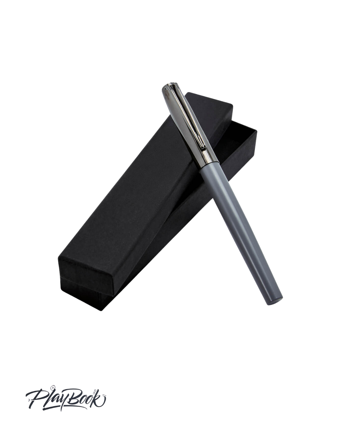 Bolígrafo metálico con tapón. Cuerpo en color gris y el tapón en color gun. Incluye estuche.