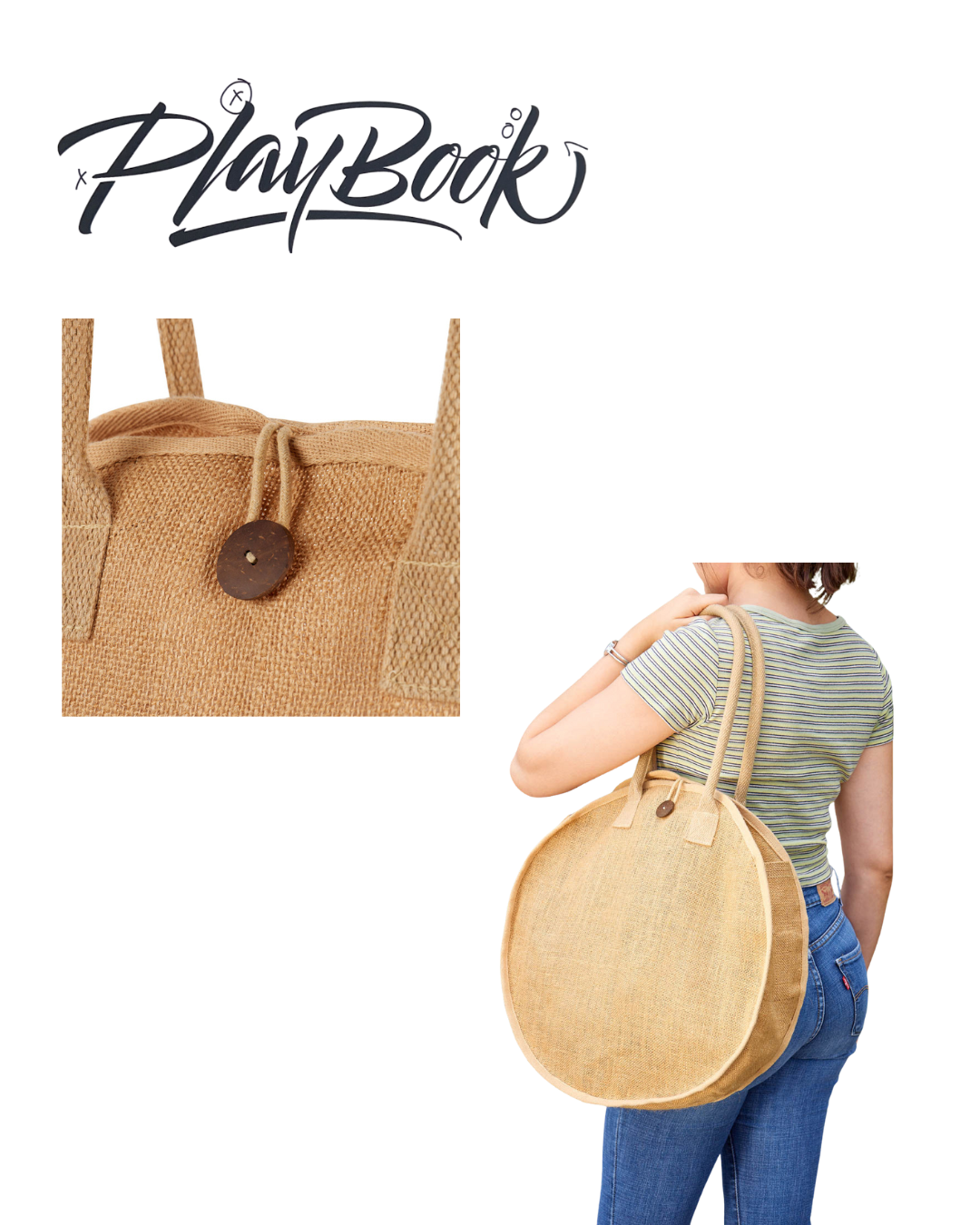 Bolsa con asas de algodón, fuelle y compartimento principal con elástico y botón de madera para abrir o cerrar. El yute es un producto natural el cual puede presentar variaciones en tonalidades y en la urdimbre y trama de la tela.