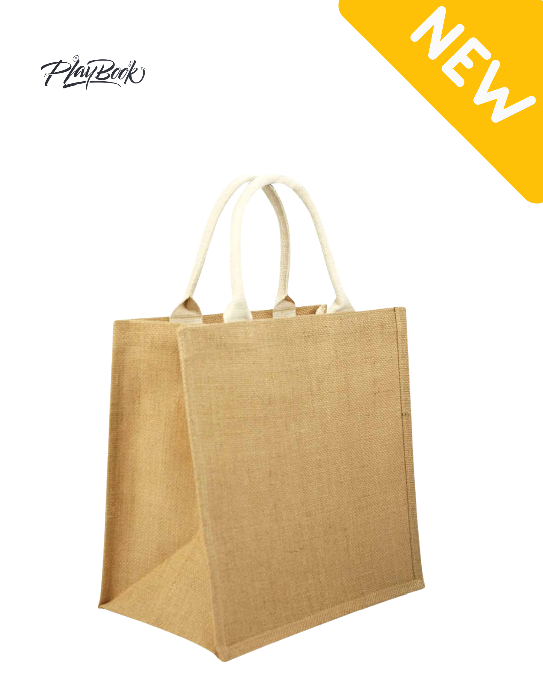 Bolsa con fuelle y asas redondeadas. Interior plastificado. El yute es un producto natural el cual puede presentar variaciones en tonalidades y en la urdimbre y trama de la tela.