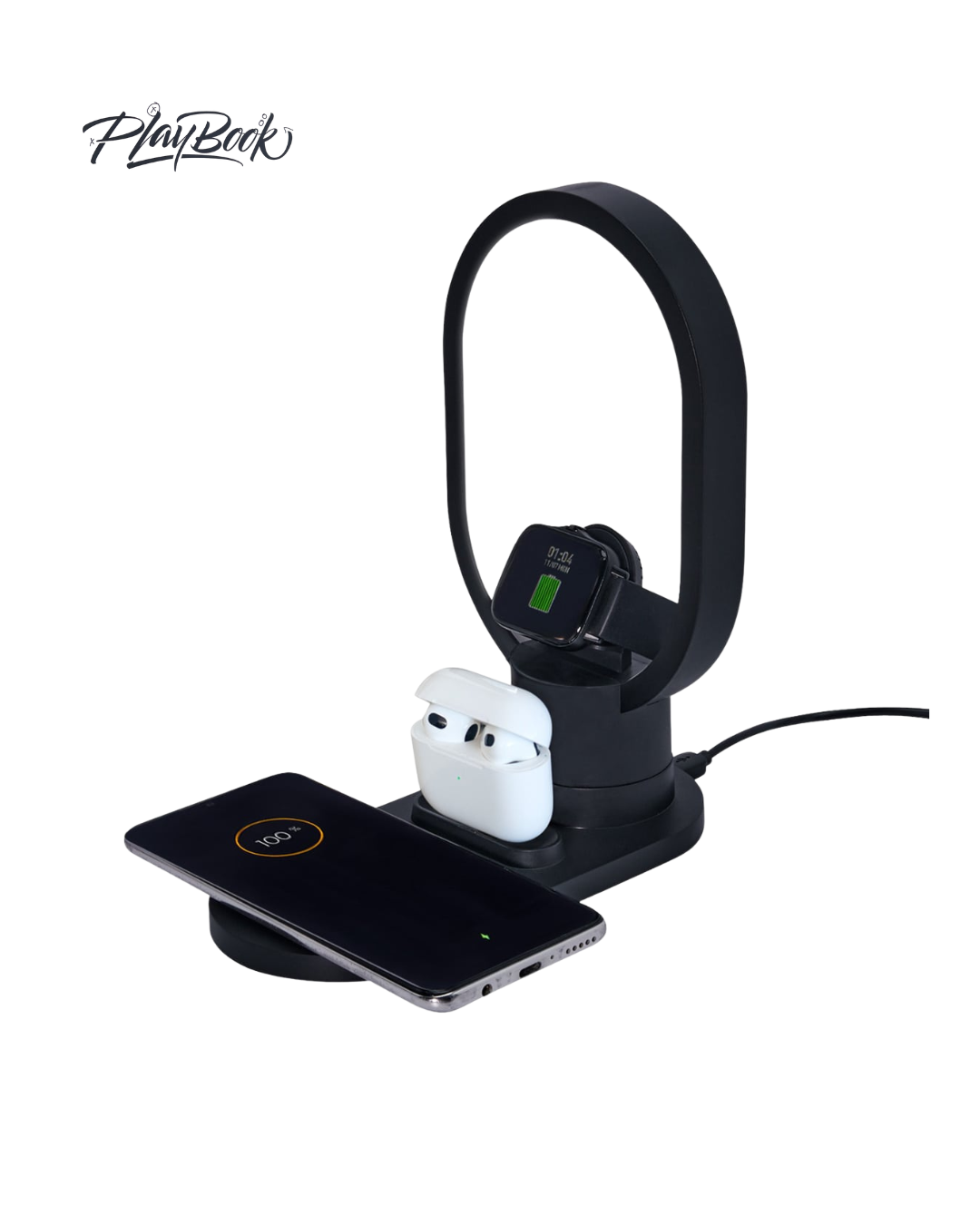 Base con cargador inalámbrico para smartphone, cargador inalámbrico para reloj inteligente, cargador para earbuds y lámpara de noche con luz cálida. Velocidad de carga de 5W / 7.5W / 10W / 15W. Base giratoria con touch para encender la lámpara. Compatibles con dispositivos que cuenten con tecnología de carga inalámbrica.