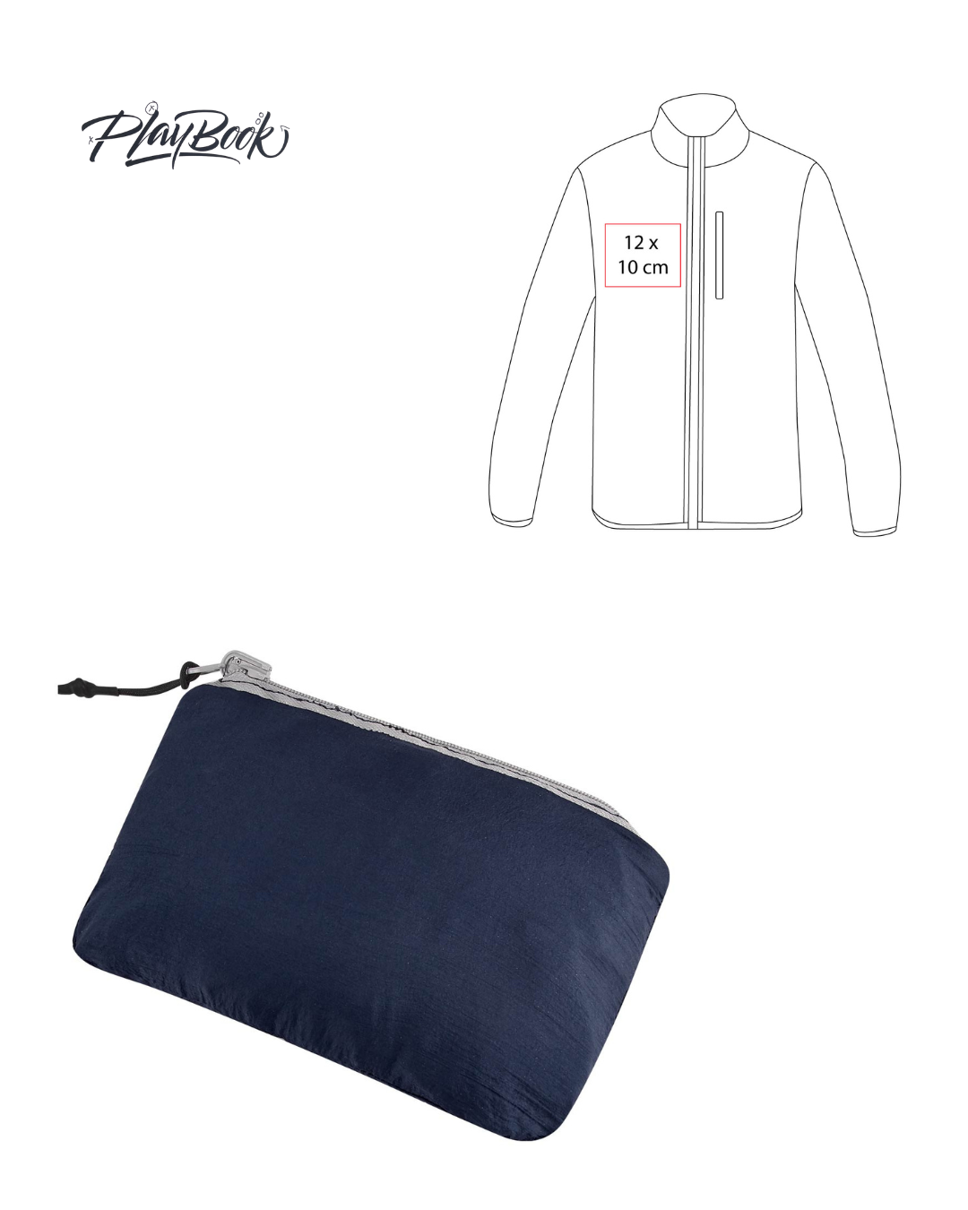 Chamarra deportiva ligera plegable con funda en cierre. 100% Poliéster.