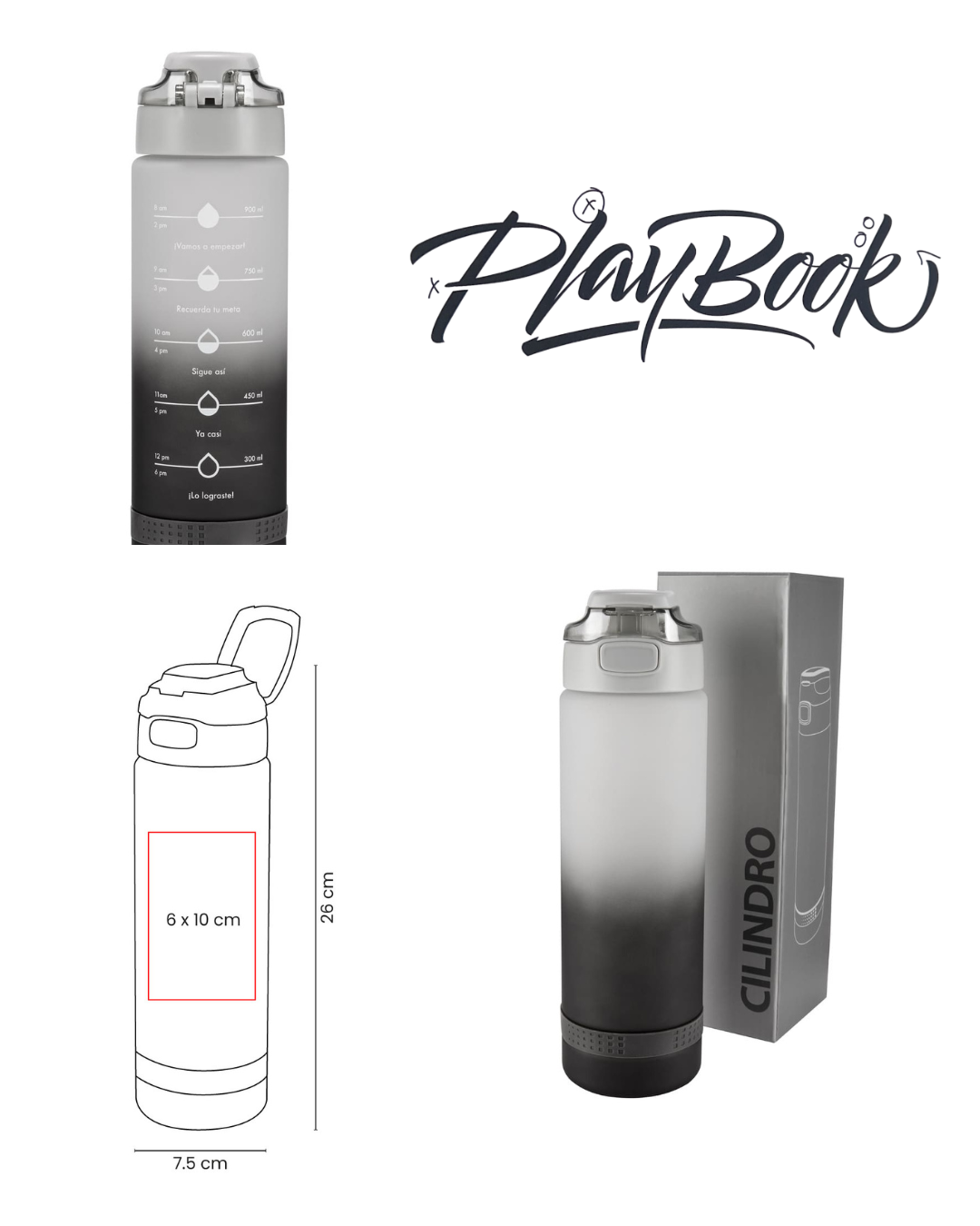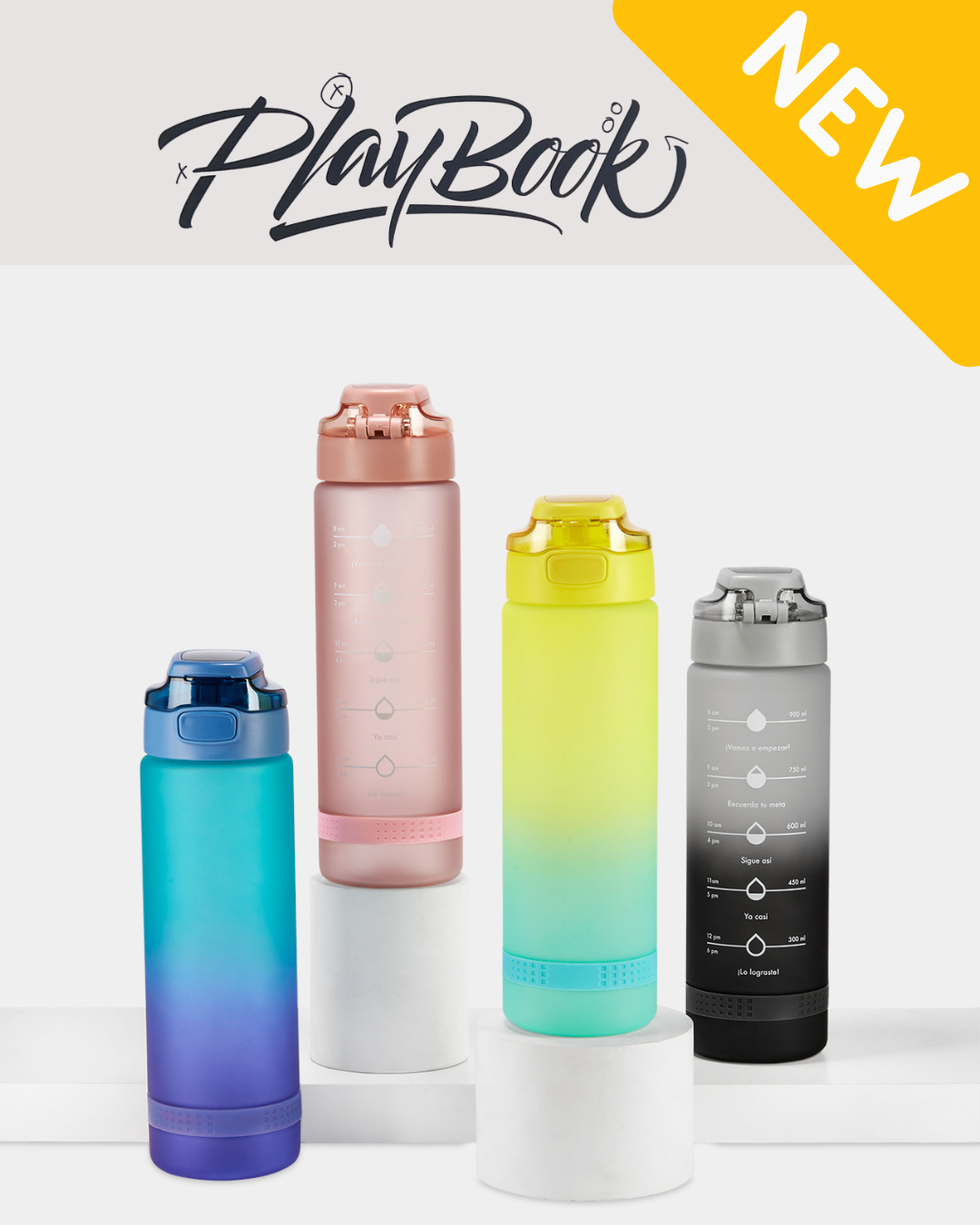 Tapa de plástico con cierre de rosca hermética y boquilla. Sobretapa push con botón y asa plegable. Cuerpo con terminado tipo rubber, suave al tacto. Cuenta con un detalle de silicón en la parte inferior. Incluye marcador de mililitros y horas lo que te permite medir fácilmente la cantidad de agua que bebes a lo largo del día y llevar un control de tu hidratación. Incluye caja individual.
