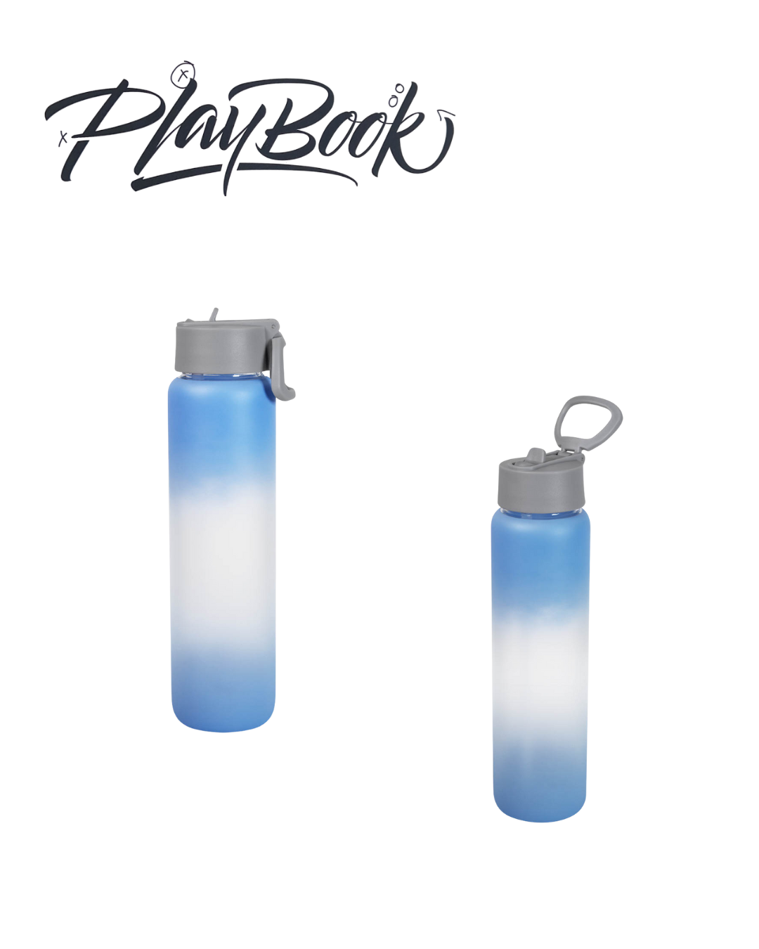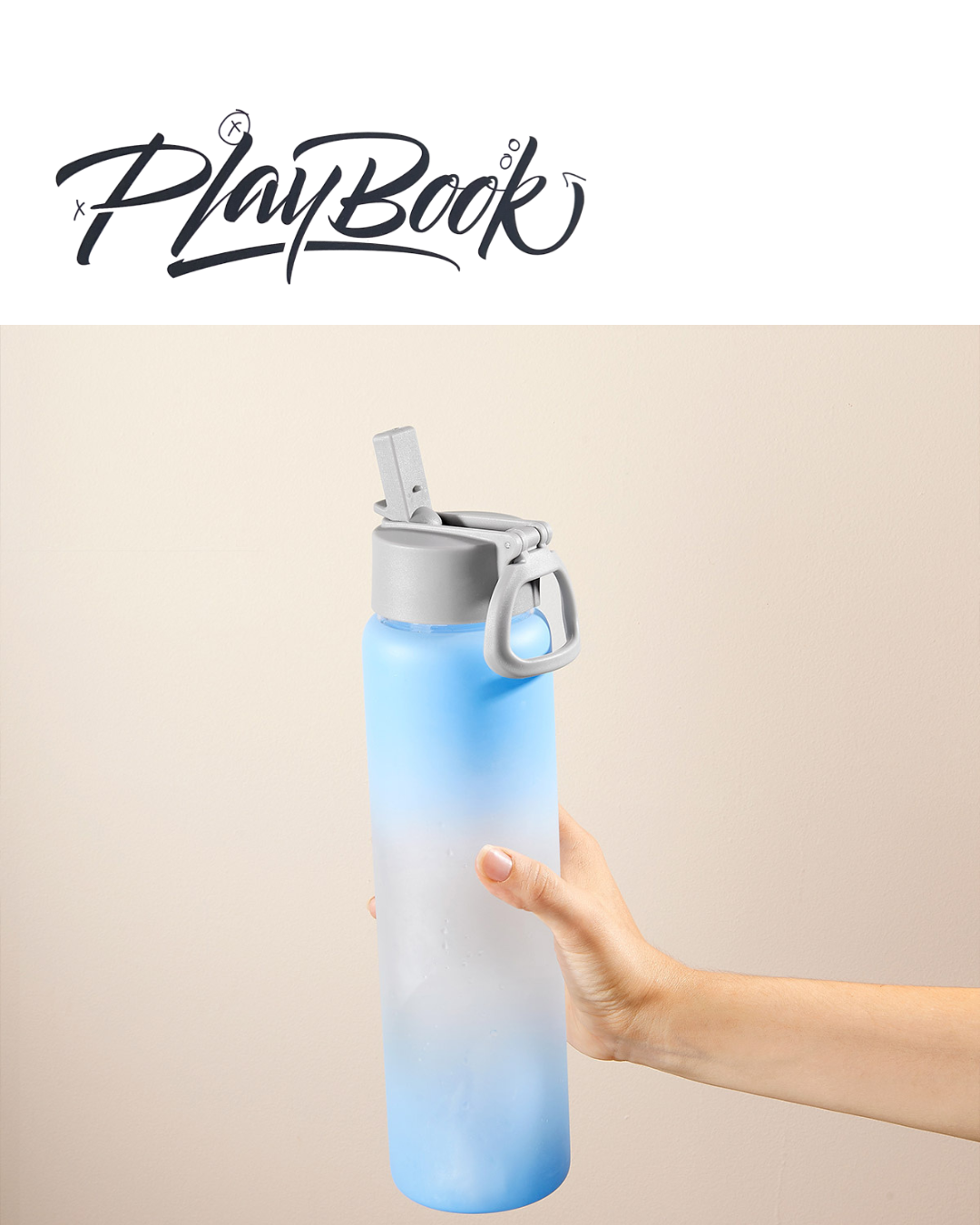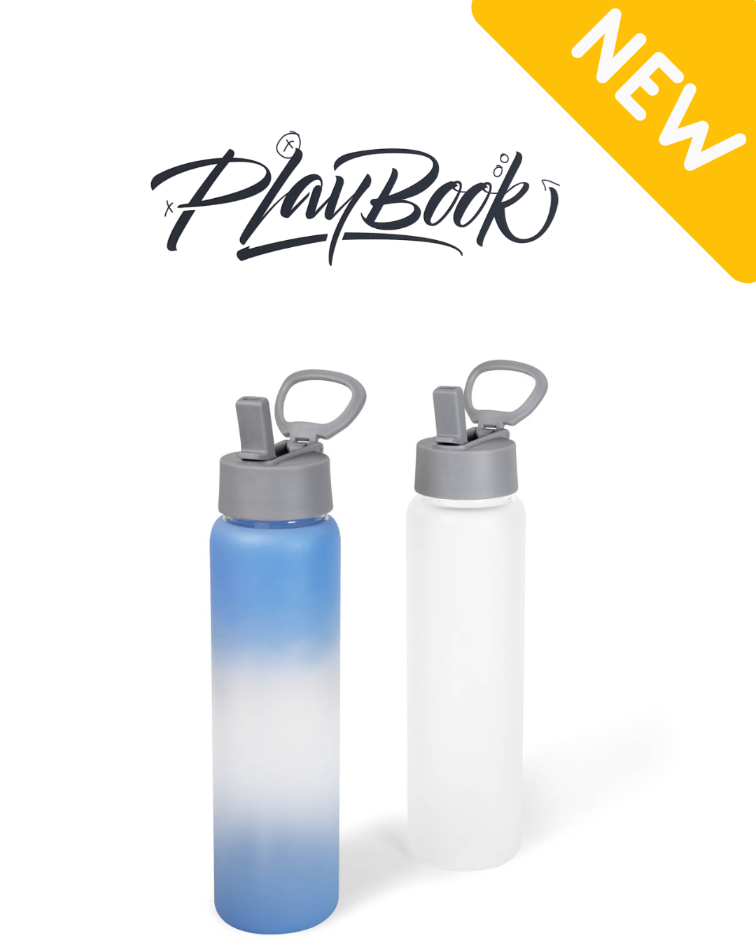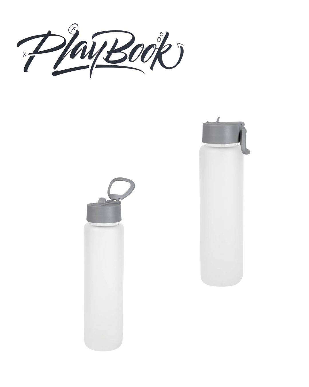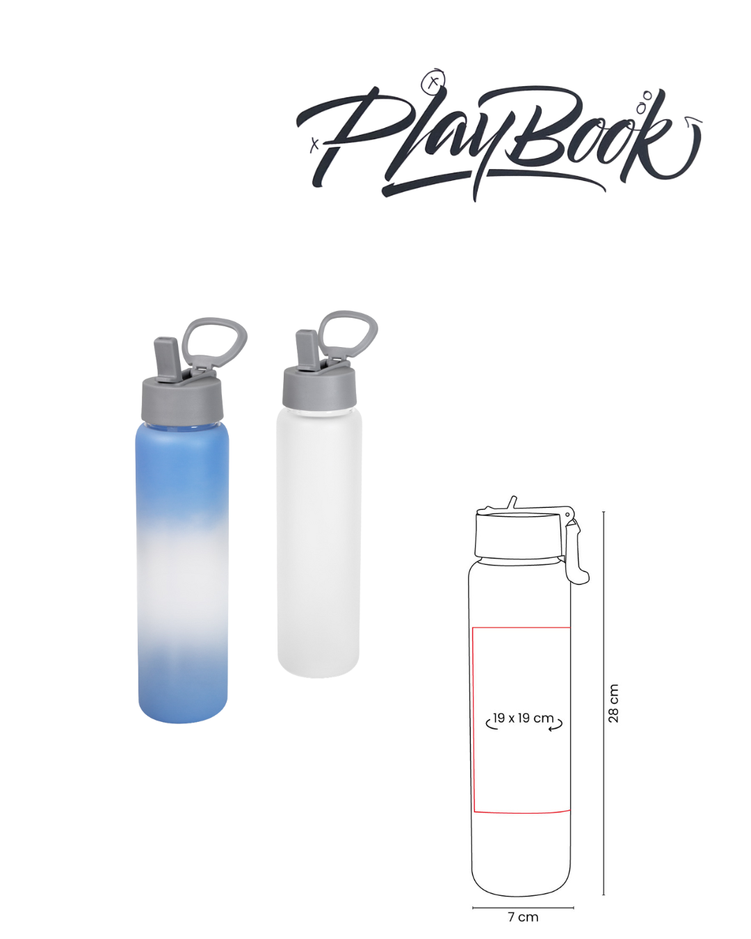Cilindro de vidrio con terminado frosty y un recubrimiento especial para sublimar. Tapa de plástico con cierre de rosca asa y popote retráctil. Incluye caja individual.