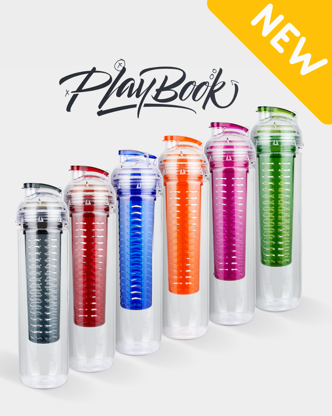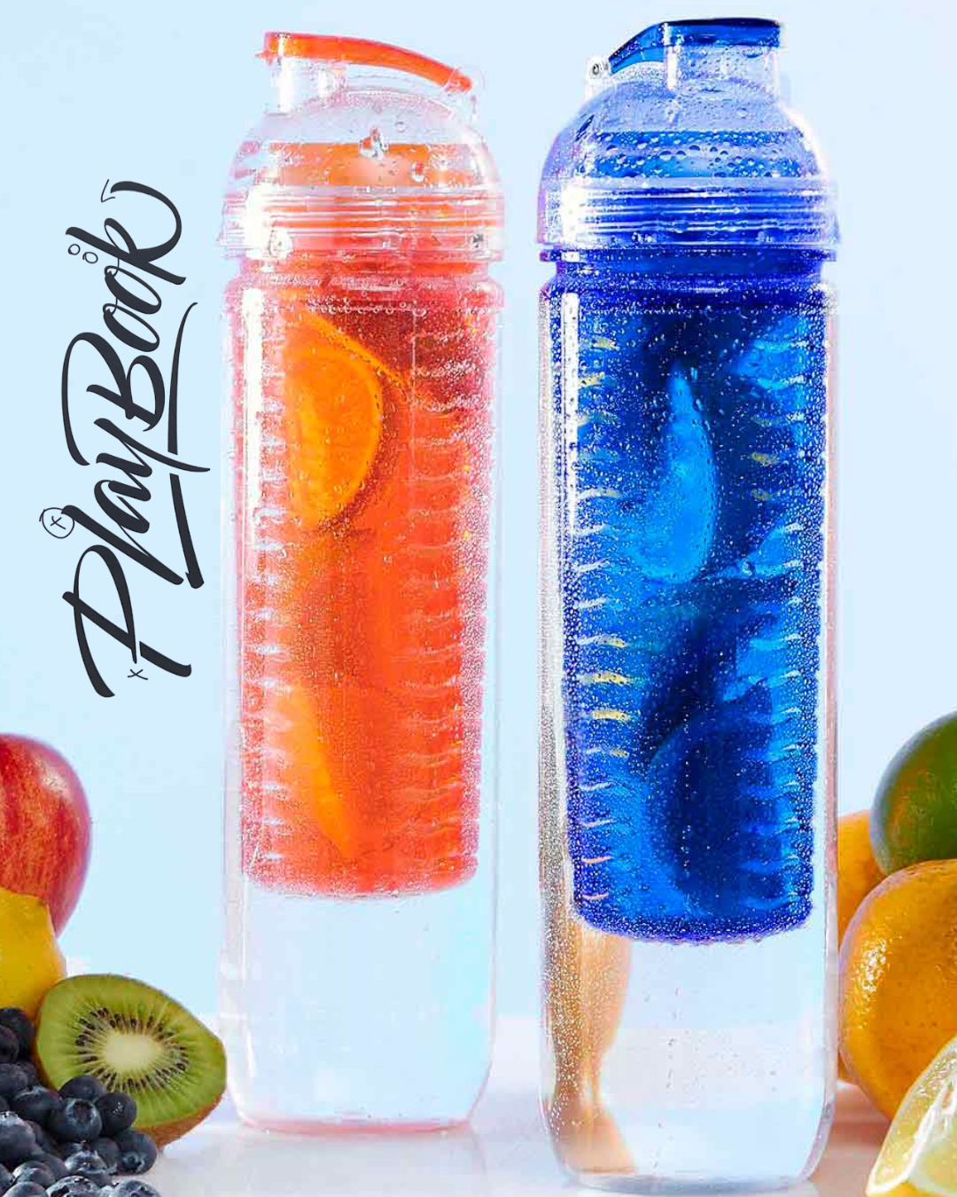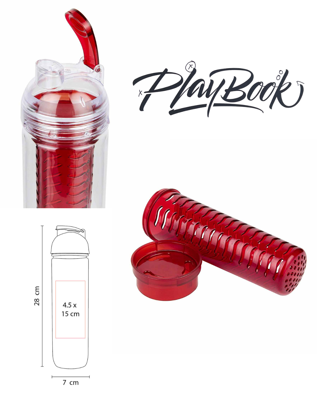 Cilindro con infusionador para frutas o bolsas de té. Tapa con sistema de rosca boquilla y sobre tapa que cierra a presión. Incluye caja individual.