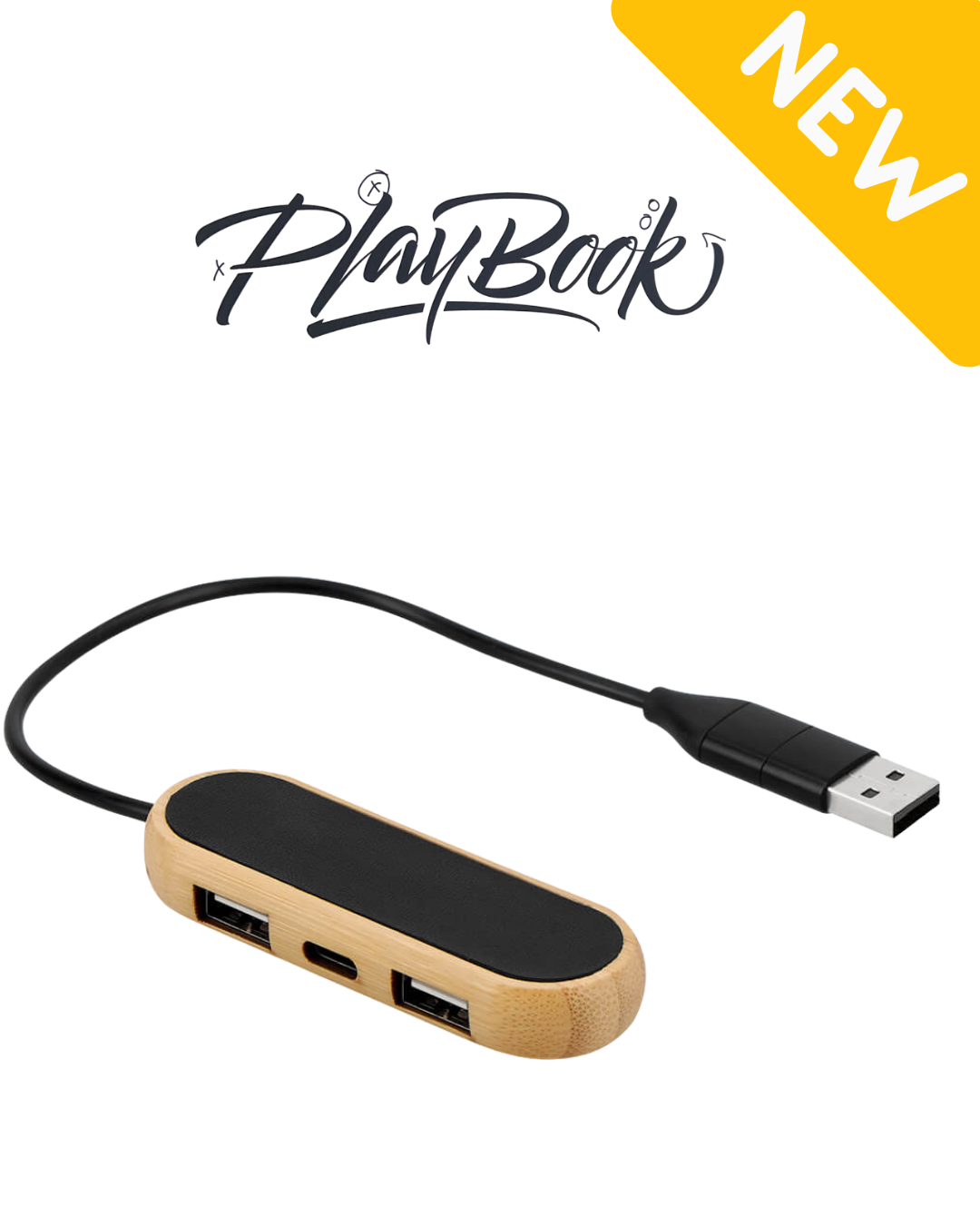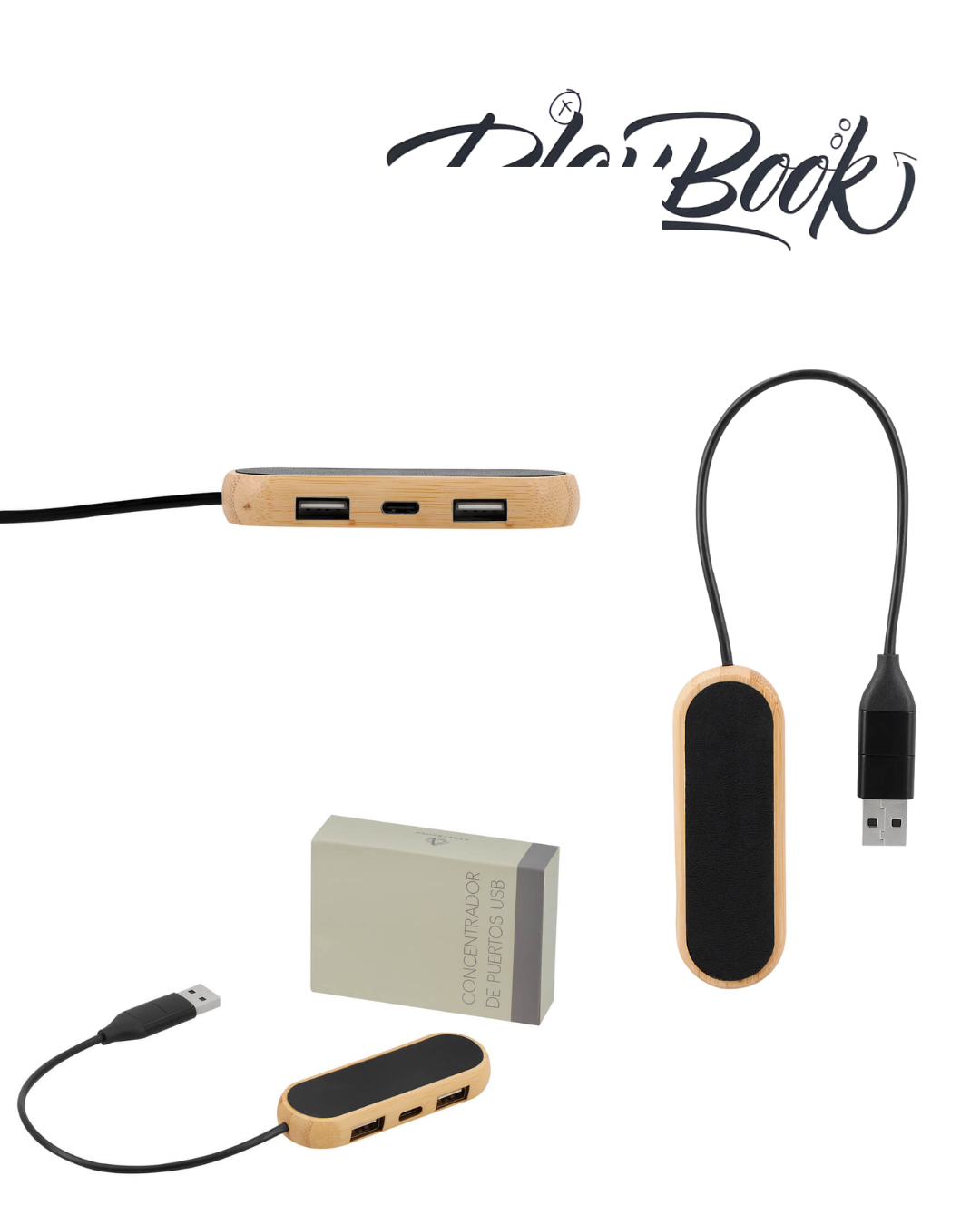 Concentrador con 2 puertos USB 2.0 y 1 puerto tipo C. Soporta transferencia de datos. Cable de conexión con USB y tipo C. El bambú es un producto natural el cual puede presentar variaciones en tonalidades y vetas.
