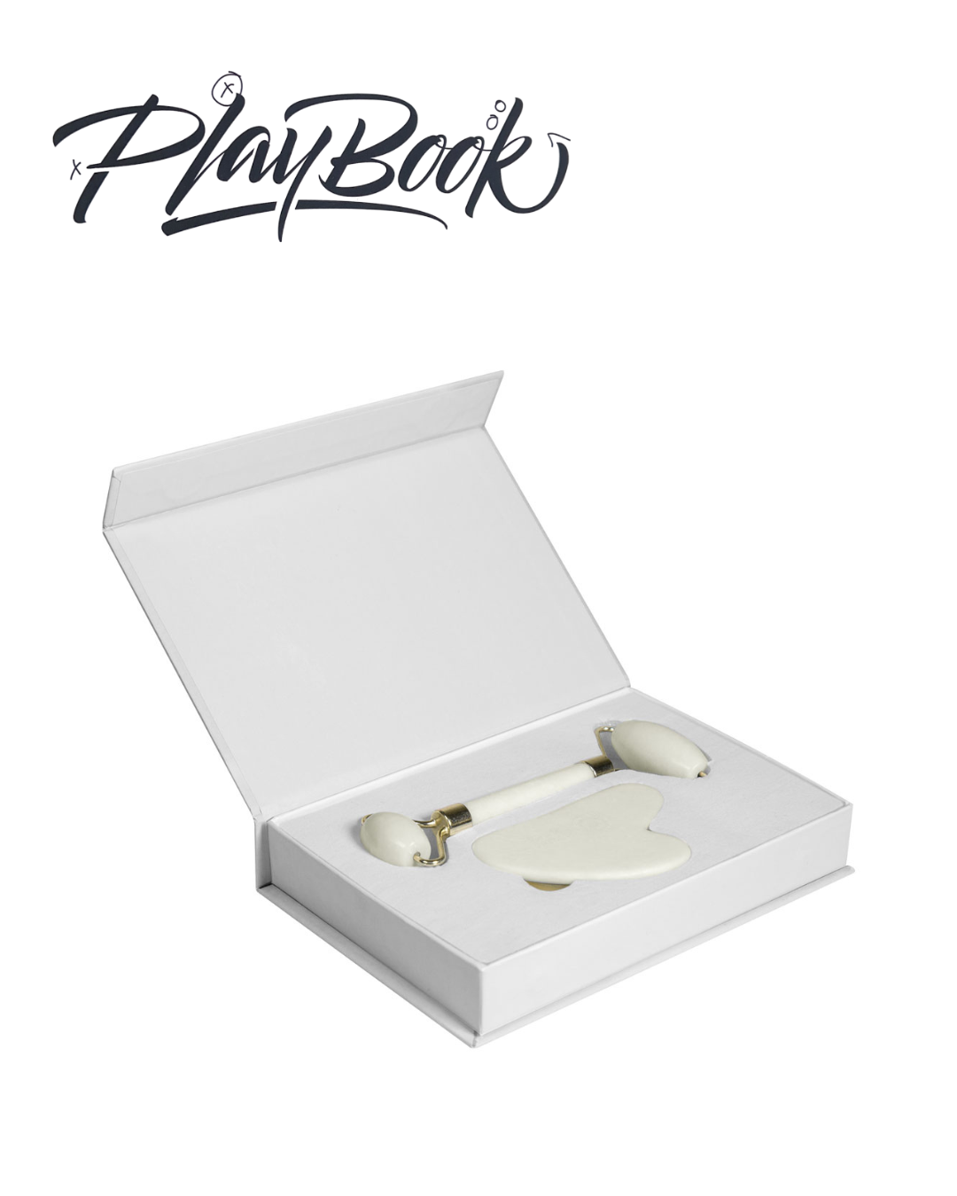 Set masajeador facial. Incluye 1 rodillo para estimular y masajear la piel, para mejorar la circulación sanguínea y reducir la hinchazón facial. Piedra facial Gua Sha, para aplicar presión y realizar movimientos de deslizamiento sobre la piel. Ayuda a aliviar la tensión muscular y a mejorar la absorción de productos para el cuidado de la piel. Caja individual con cierre imantado.