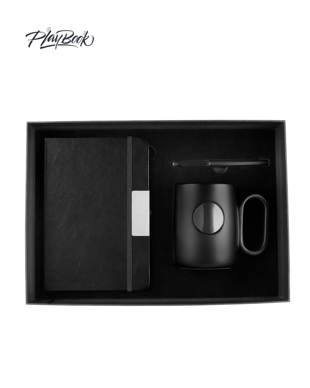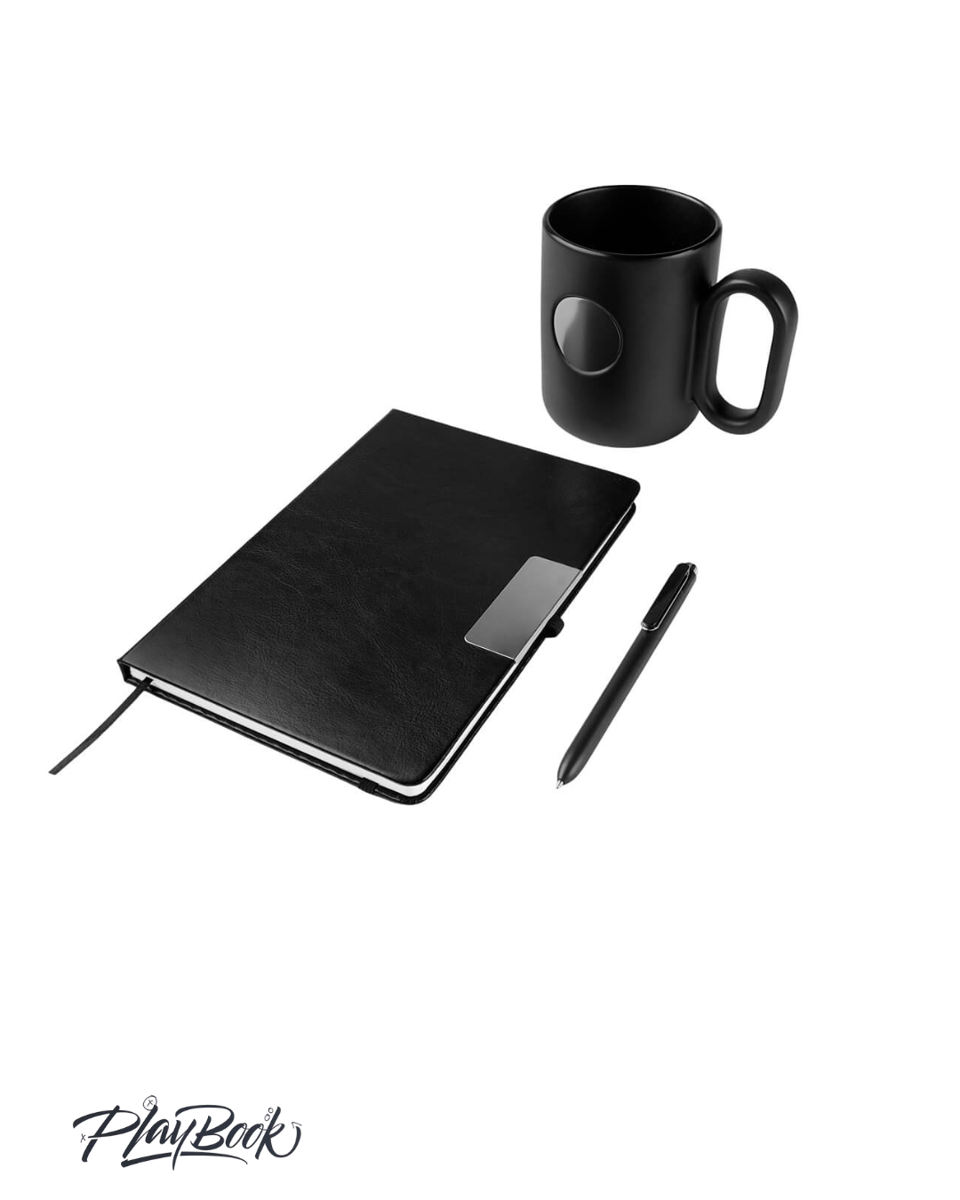 Set de regalo ejecutivo de 3 piezas. Contiene libreta de pasta dura con 80 hojas recicladas a raya y placa metálica. Incluye listón separador y elástico porta bolígrafo. Bolígrafo de plástico con mecanismo pulsador y taza de carámica con placa metálica circular. Capacidad de 473 ml. Incluye caja de regalo rígida.