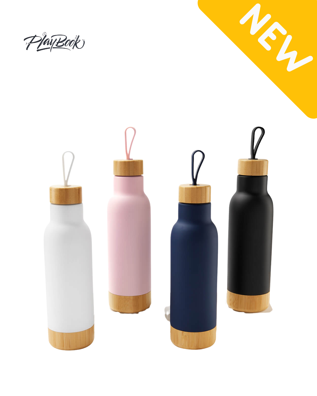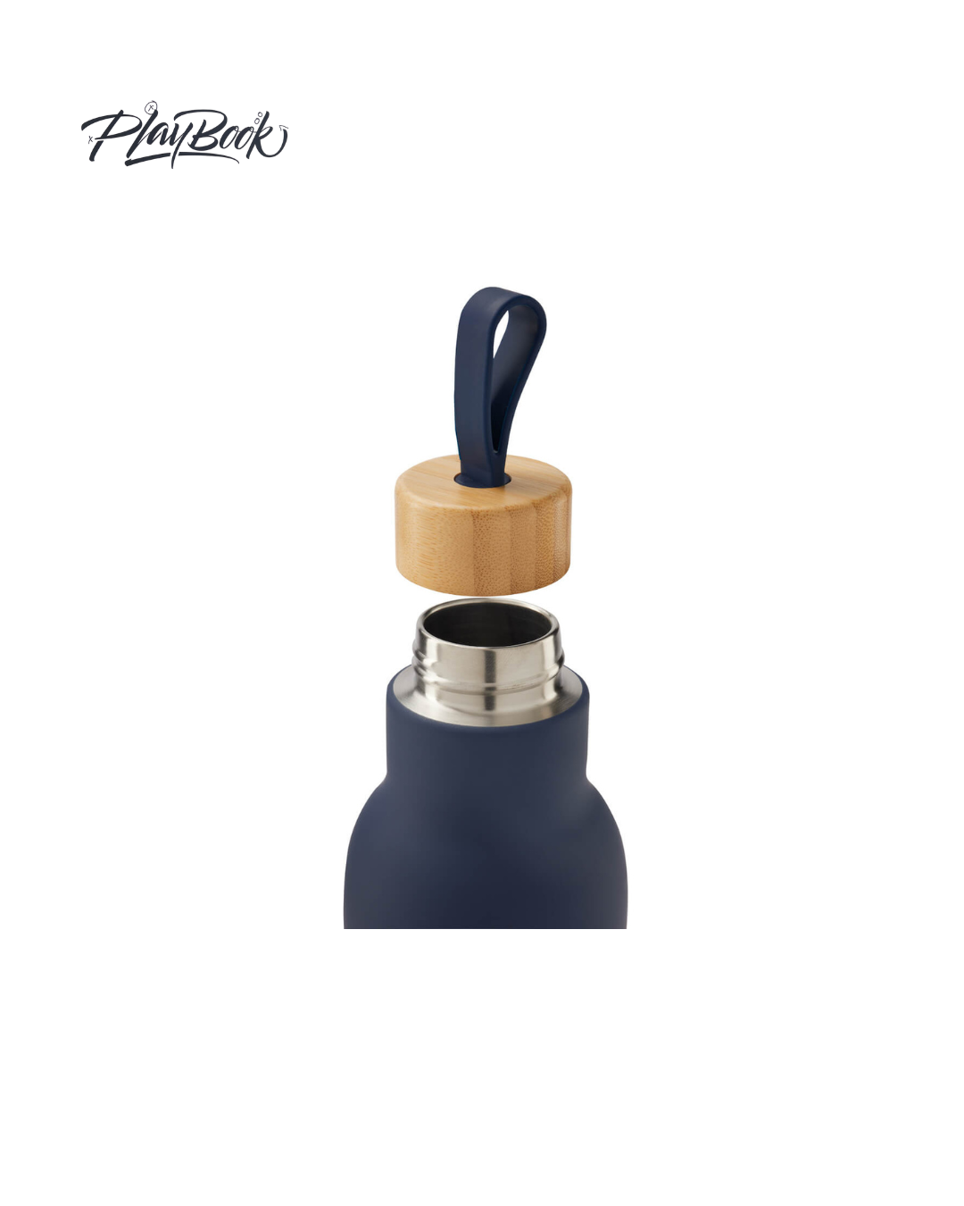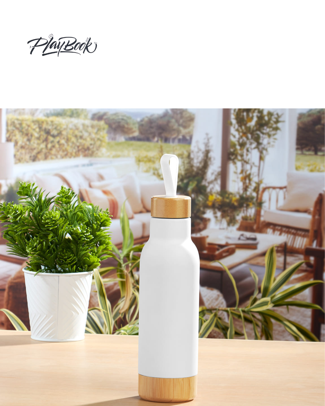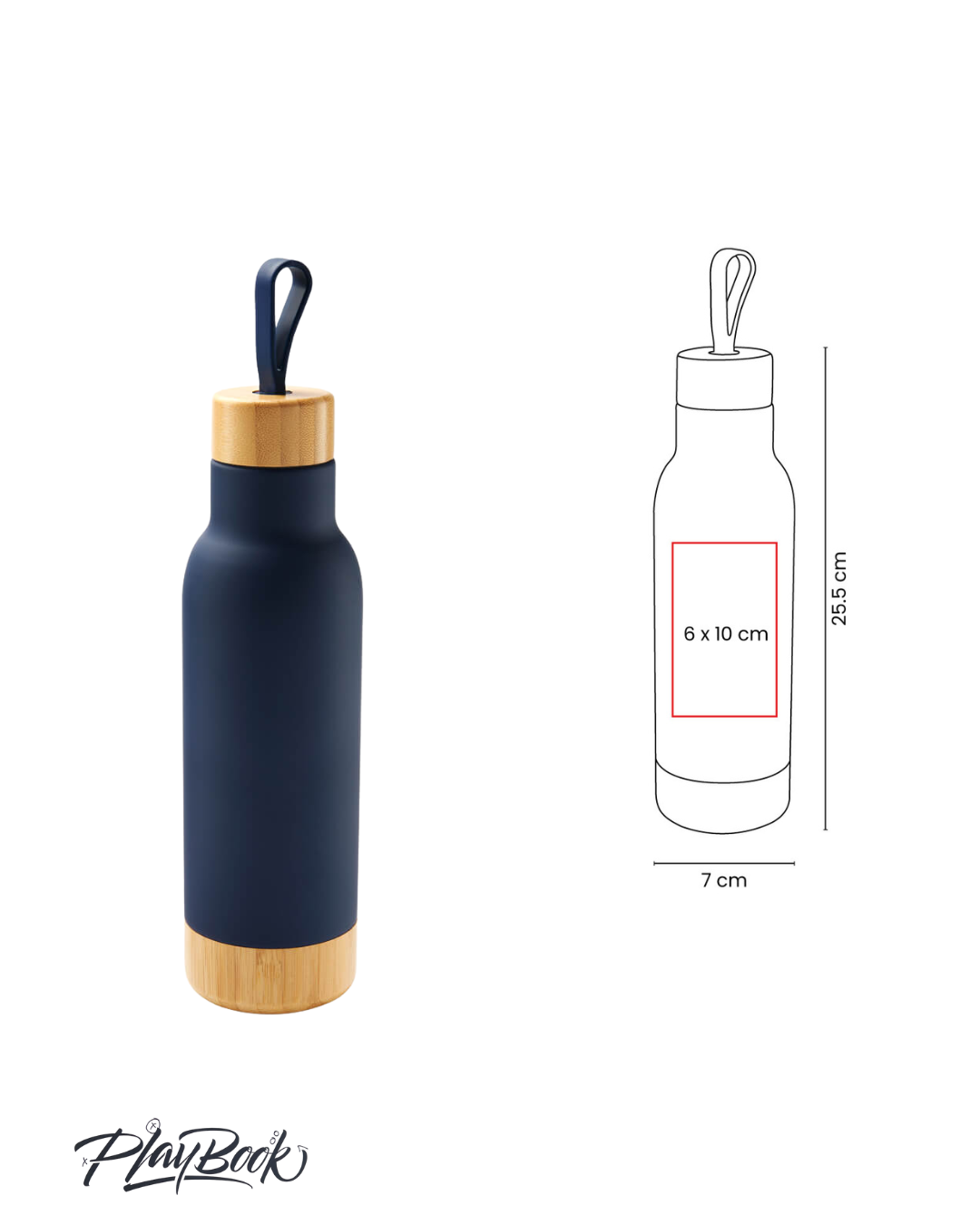 Doble pared. Cerrado al vacío. Pared interna y externa de acero inoxidable. Tapa de bambú con sistema de rosca, asa de silicón y base de bambú. Mantiene temperatura caliente 6 hrs y temperatura fría 12 hrs. Incluye caja individual. El bambú es un producto natural el cual puede presentar variaciones en tonalidades y vetas.