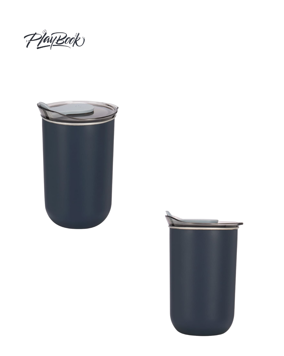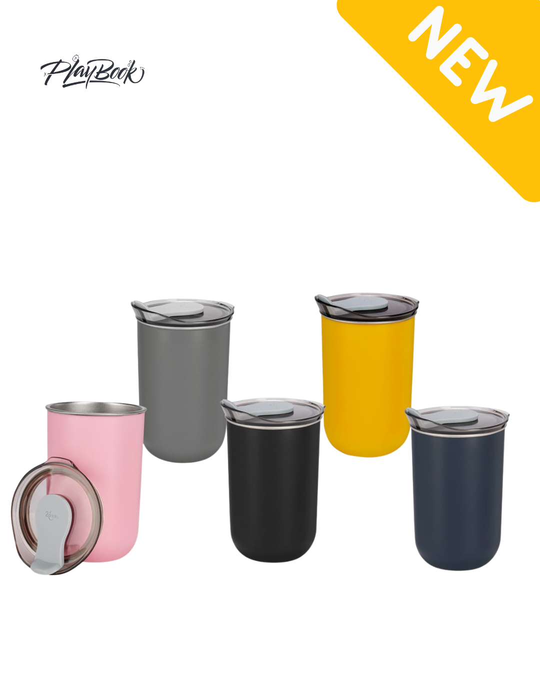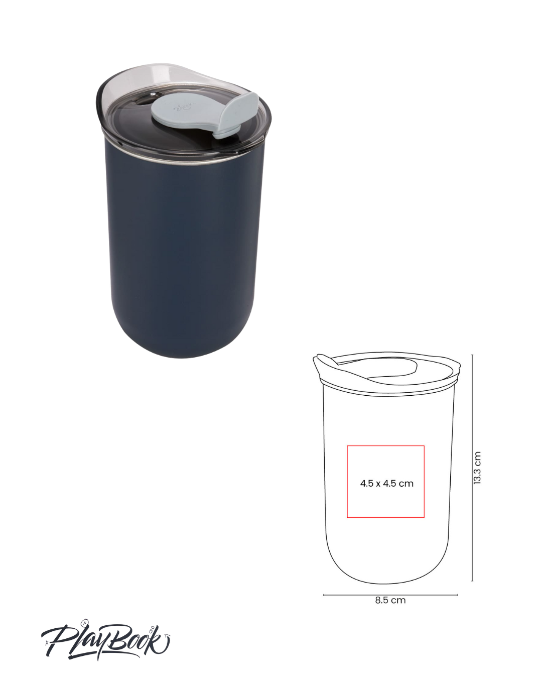 Doble pared. Pared interna de acero inoxidable y externa de plástico. Tapa de plástico con sistema push y sobretapa de silicón movible. Incluye caja individua
