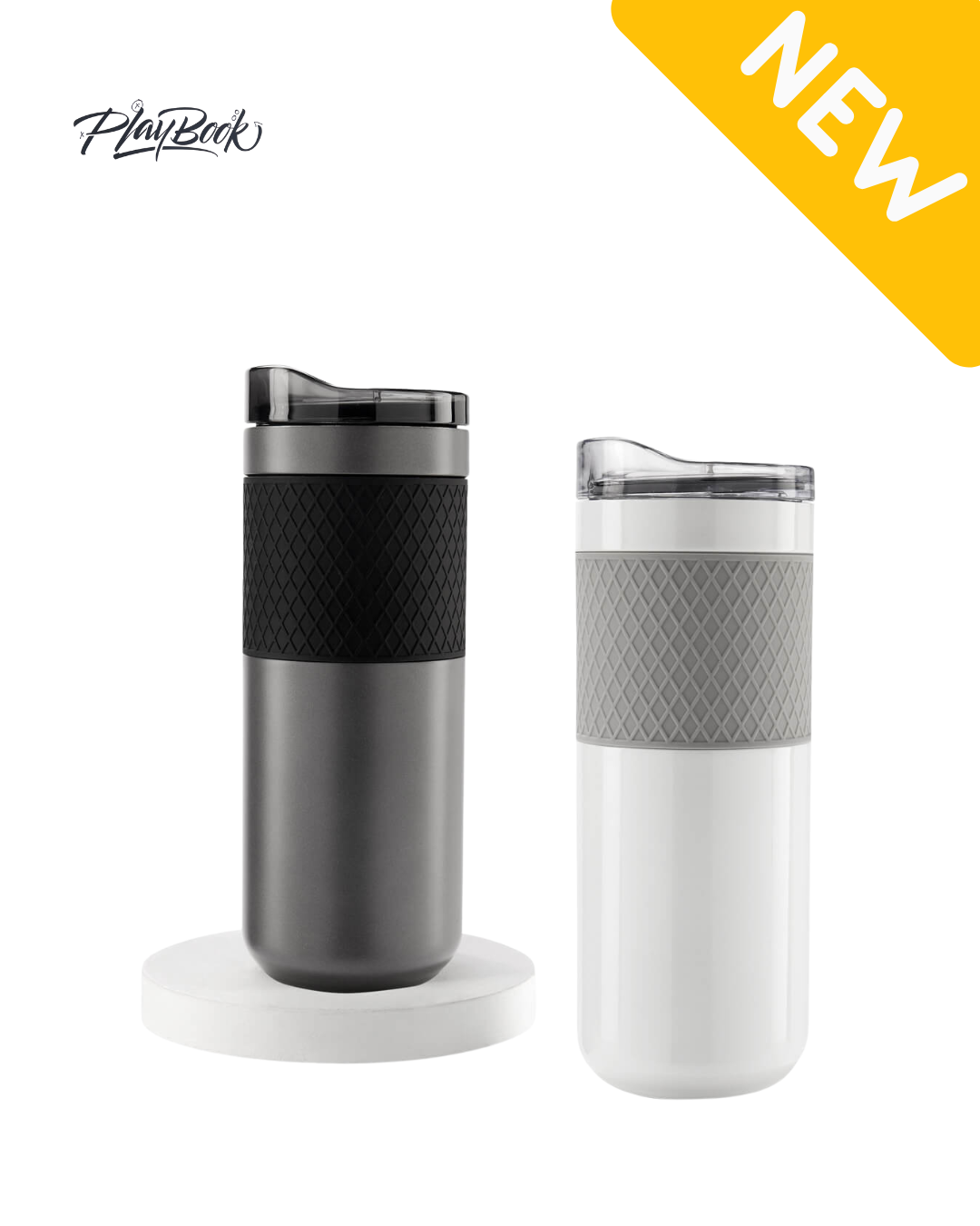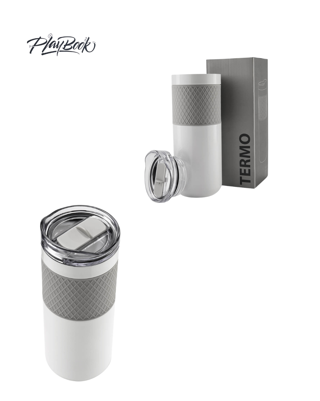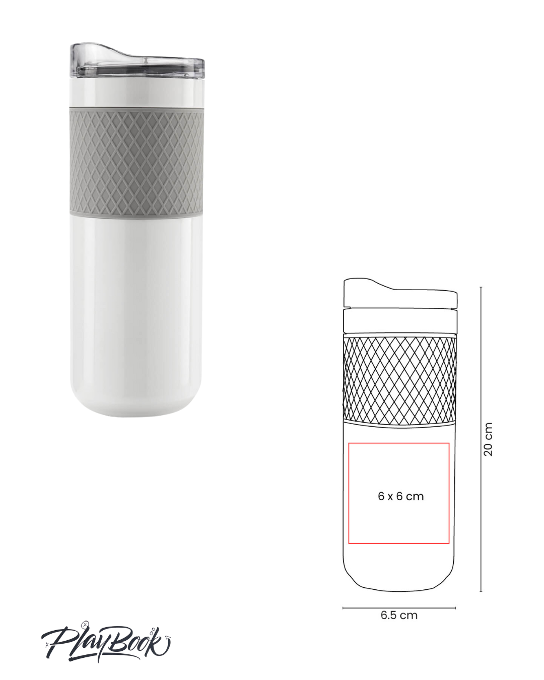 Doble pared. Cerrado al vacío. Pared interna y externa de acero inoxidable. Incluye tapa de plástico con cierre de rosca y válvula de seguridad. Banda de silicón texturizada antiderrapante. Mantiene temperatura caliente 6 hrs y temperatura fría 8 hrs.Incluye caja individual.